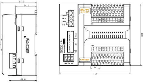 (1)CAN-bus支持CAN2.0A和CAN2.0B帧格式,符合ISO/DIS 11898规范;(2)CAN-bus通讯波特率在10Kbps~1Mbps之间任意可编程;(3)CAN-bus接口采用电气隔离,隔离模块绝缘电压:DC 1500V;(4)电源采用24V DC(-15%/+20%);(5)数字量输入通道数:16路;(6)数字量输出通道数:16路;(7)数字量输入、输出信号:输入可通过接线切换源/漏型;输出默认晶体管PNP输出,可选NPN输出;(8)数字量输入ON信号:电压≥9V DC;输入OFF信号:电压≤5V DC;(9)PNP源型数字量输出电压为IO的工作电压24V,输出电流最大值为500mA(单通道);300mA(通道同时输出);(10)NPN漏型数字量输出电压为IO的工作电压24V,输出电流最大值为500mA(单通道);280mA(通道同时输出);(11)EMC抗干扰通道支持:模块供电通道、CAN通道;(12)模块供电通道:静电接触放电±4KV,静电空气放电±8KV,电快速瞬变脉冲群±2KV,雷击(浪涌)±1KV;(13)CAN通道:1500VDC电气隔离,静电接触放电±8KV,电快速瞬变脉冲群±2KV,雷击(浪涌)±4KV;使用拨码开关配置模块波特率及节点号;(14)工作温度范围:-40℃~+85℃;(15)尺寸:长115mm*宽100mm*高58mm。