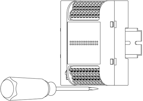 先将模块下方的导轨卡扣用一字螺丝刀拉出;然后将模块挂到DIN导轨上,并使用一字螺丝刀将下方的导轨卡扣推进去锁定,如图所示: