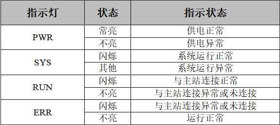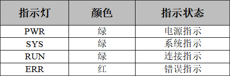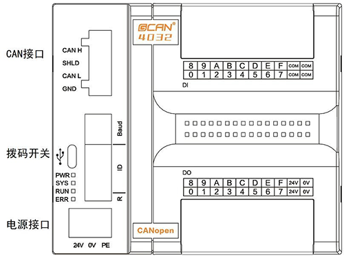 GCAN-4032 CANopen远程IO模块有两组指示灯,分别为系统状态指示灯和IO指示灯。系统状态指示灯具有1个PWR指示灯、1个SYS指示灯、1个RUN指示灯、1个ERR灯来指示设备的运行状态。