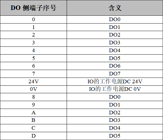 GCAN-4032的主控模块含有上下四排端子排,下方两排端子排为DO端子排,分别为DO0~DO7,DO8~DOF共16个数字量输出点,以及2组IO工作电源接口(请任选1组IO工作电源接口接入24V即可,注意同时需要接入系统电源,系统电源详见下表,IO工作电源与系统电源彼此隔离),如图所示。各个端子对应的序号及其含义如下表所示。