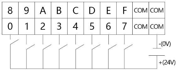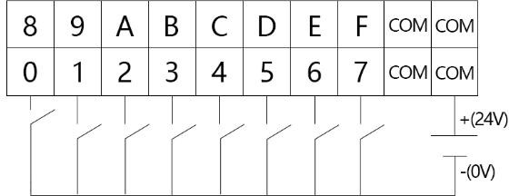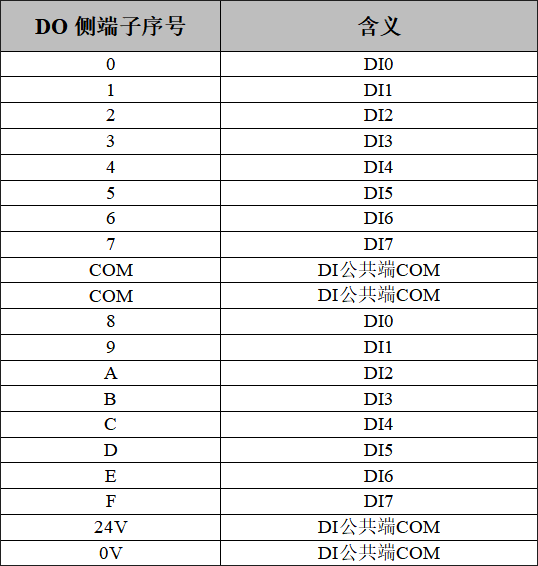 上方两排端子为DI端子排,分别为DI0~DI7,DI8~DIF共16个数字量输入点,以及4个DI的COM接口(4个COM口任意连接1个即可),如图所示。各个端子对应的序号及其含义如表所示。