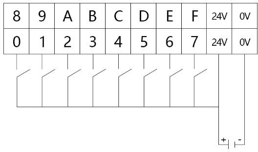 数字量输入的状态由两个字节来表示,第0到7路由第一个字节表示;第8到F路由第二个字节表示。举例:第一个字节里通道8在高位,通道1在低位。