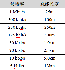 CAN-bus网络的拓扑结构请注意:CAN-bus电缆可以使用普通双绞线、屏蔽双绞线。理论最大通信距离主要取决于总线波特率,最大总线长度和波特率关系详见下表。若通讯距离超过1km,应保证线的截面积大于Φ1.0mm2,具体规格应根据距离而定,常规是随距离的加长而适当加大。
