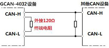 请注意:GCAN-4032模块内部未集成120Ω终端电阻。如果节点数目大于2,中间节点不需要安装120Ω的终端电阻。需要使用时,将电阻两端分别接入CAN_H、CAN_L即可,如图所示。