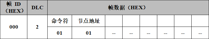 GCAN-4032模块接收由主站发出的操作指令,帧ID为0x000,DLC为2,帧数据第一个字节为命令符,第二个字节为节点号(00则为全部节点)。