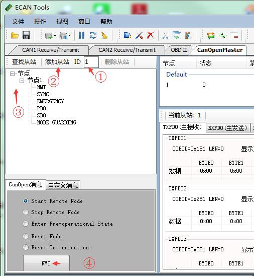 例如:GCAN-4032的Node ID为1,命令GCAN-4032为进入操作状态(01),则NMT命令帧ID为0x000,帧数据为0x01,0x01。该命令也可由GCANTools软件的CANopenMaster插件发出。
