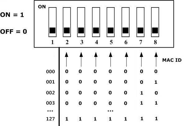 如图所示,拨码开关的每个位拨向“ON“位置时,该位为“1”,如果拨向“OFF”位置,则该位为“0”。拨码开关的2-8位用于设定模块的节点号(MAC ID),第八位为最低位,第二位为最高位,模块的节点号(MAC ID)是各位对应的十进制值之和,通过拨码开关设定模块的节点号(MAC ID)的有效范围为0~127。