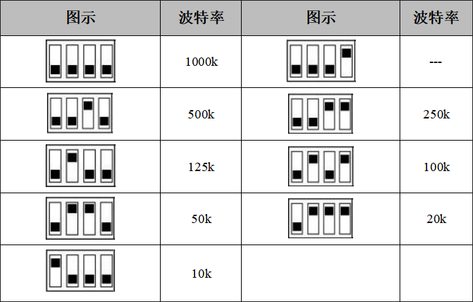 右侧拨码开关的1-4位用于设定模块的波特率,第一位为低位,第四位为高位。波特率与开关设置对应值如下表所示。