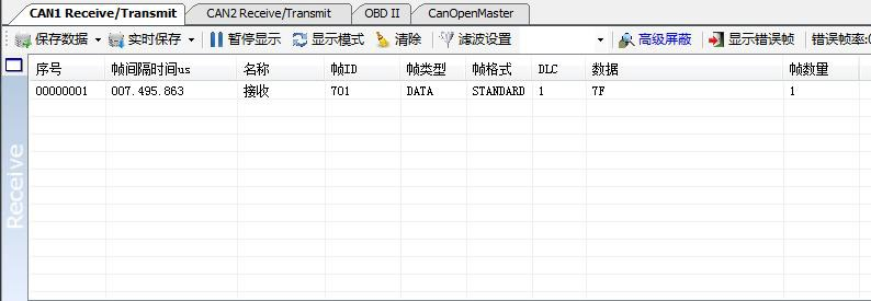 例如:通过拨码开关设置GCAN-4032的Node ID为1(以下节点号均为1),则USBCAN-II Pro作为主站设备可接收到一条节点状态数据,帧ID为0x701,帧数据为0x7F。如图所示,使用GCANTools软件可以收到这条数据。