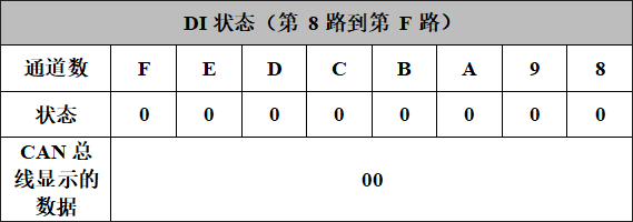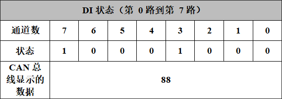 例如,GCAN-4032模块节点号设为1。通道7和通道3状态为1,其他状态均为0,则CAN总线一端显示的DI状态数据为88 00。则发出的帧ID为0x181,数据长度(DLC)为2,帧数据为0x88,0x00。