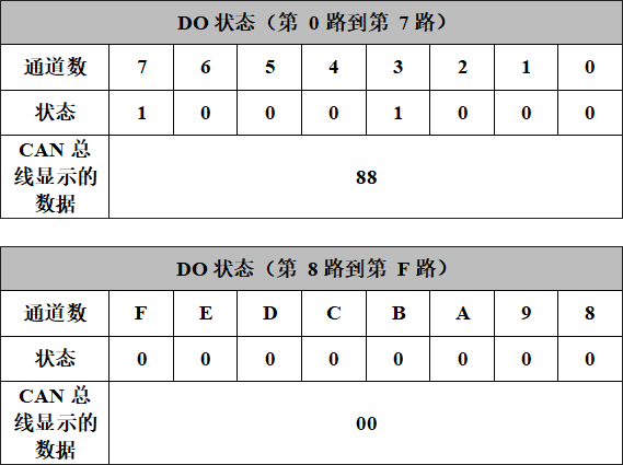 数字量输出的状态由两个字节来表示,第0到7路由第一个字节表示;第8到F路由第二个字节表示。举例:第一个字节里通道8在高位,通道1在低位。