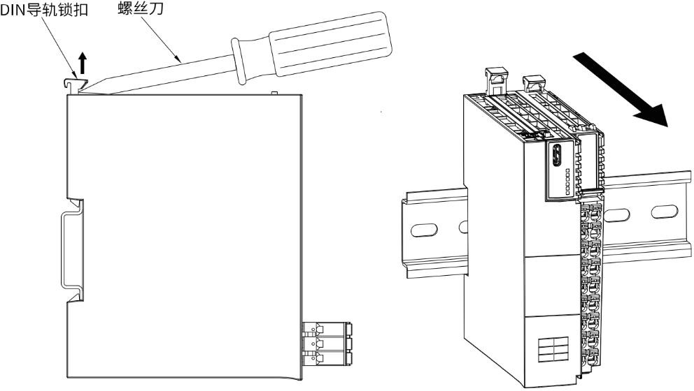 GCAN-IO-8001总线耦合器的安装方法如图所示,您可以使用一字螺丝刀进行辅助安装拆卸。首先把GCAN-IO-8001总线耦合器安装在导轨上,再按下锁扣并发出“咔”的一声。