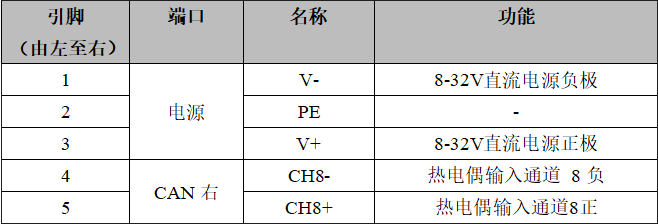 GCAN-4048模块的电源接口、4路热电偶输入接口正端、4路热电偶输入接口负端接口位置如图所示,接口定义如表所示。