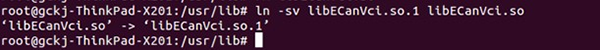 5、进入gcc编译库文件夹,把libECanVci.so.1和libECanVci.so链接到一起。输入:ln-sv libECanVci.so.1 libECanVci.so