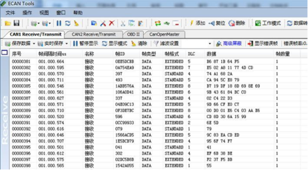 接收和发送界面是ECANTools的主要功能,在此界面,用户可以直观的看到接收到的CAN报文,以及通过普通发送或列表发送的方式,向总线上发送数据。