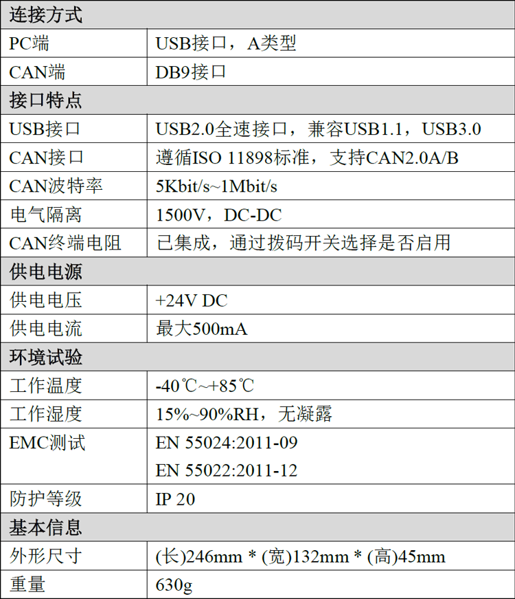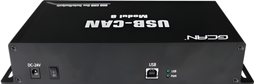 ● PC接口符合USB2.0全速规范,兼容USB1.1及USB3.0;● 集成8路CAN-Bus接口,使用DB9接线方式;● 支持CAN2.0A和CAN2.0B帧格式,符合ISO/DIS 11898规范;● CAN-Bus通讯波特率在5Kbps~1Mbps之间任意可编程;● 使用DC+24V电源供电;● CAN-Bus接口采用电气隔离,隔离模块绝缘电压:DC 1500V;● 最高接收数据流量:14000 fps;● CAN端接收报文时间戳精度可达1us;● 支持WinXP、Win7、Win10等Windows操作系统;● 支持Linux操作系统;● 支持ECANTools测试软件;● 工作温度范围:-40℃~+85℃;