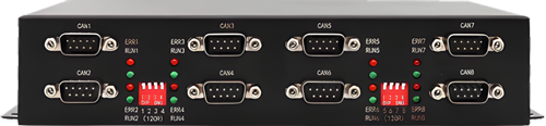 注意:USBCAN-Modul 8 内部已集成120Ω终端电阻,可通过拨码开关选择是否将电阻接入总线,拨码开关在DB9 接口侧,四条通道中间的拨码开关R1~R8分别控制对应的八条通道。