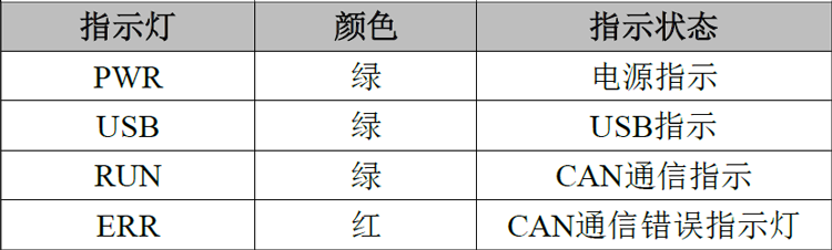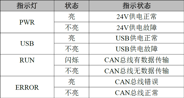 USB 接口及电源接口连接,打开供电开关,供电正常后,PWR 指示灯会亮;当CAN 端有数据传输时相应通道的RUN 灯会亮;当CAN 总线产生错误时ERR 会亮。