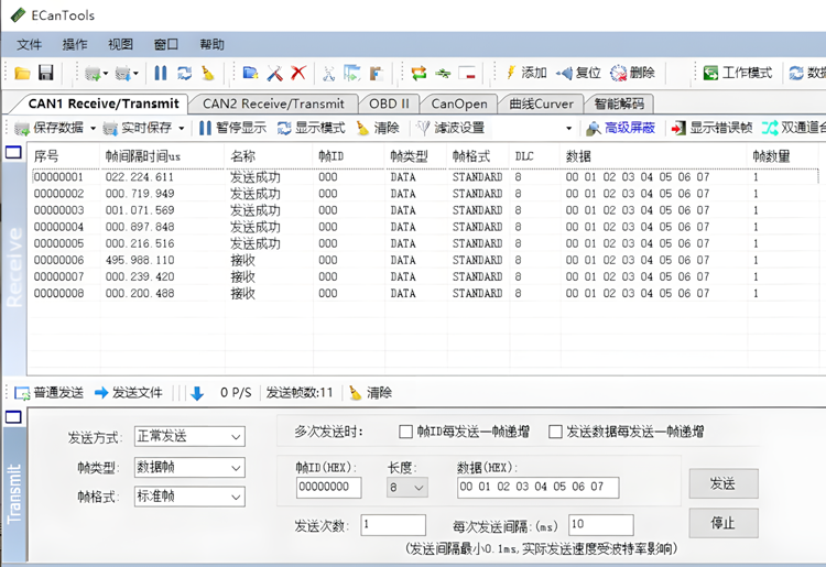 接收和发送界面是ECANTools 的主要功能,在此界面,用户可以直观的看到接收到的CAN 报文,以及通过普通发送或列表发送的方式,向总线上发送数据。