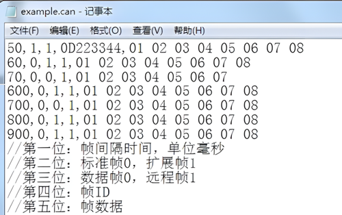 此条数据的功能是:上电等待10ms,初始化CAN1 通道收发数据,不设置触发,不替换ID 和数据,发送ID 144,标准帧,数据长度8 位,发送数据01 02.....08,发送次数100 次,每次发送时间间隔500ms。