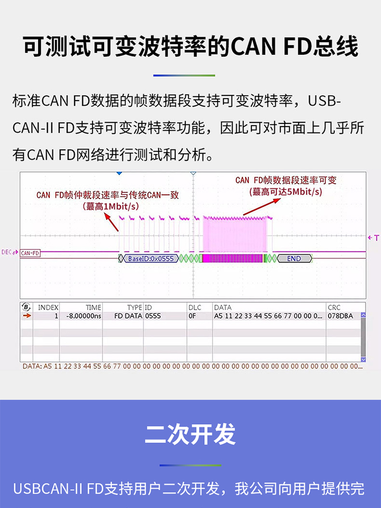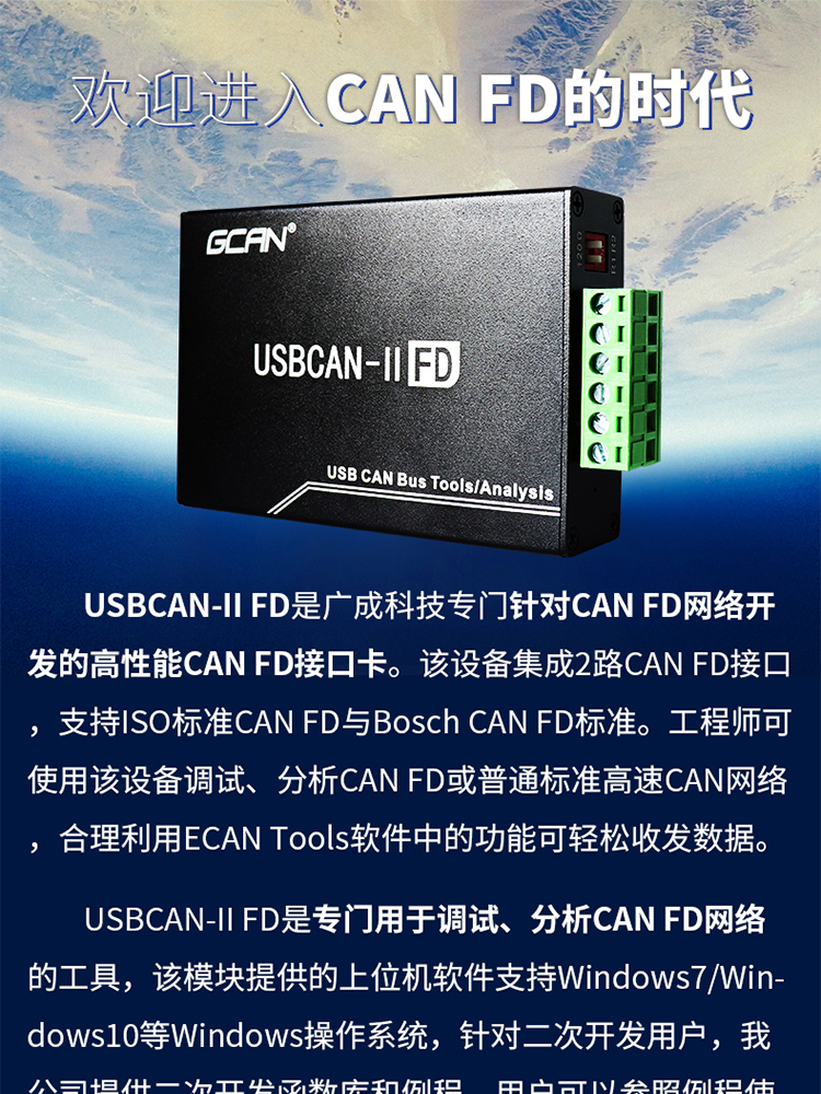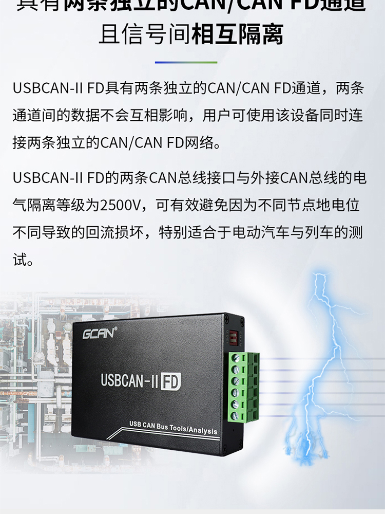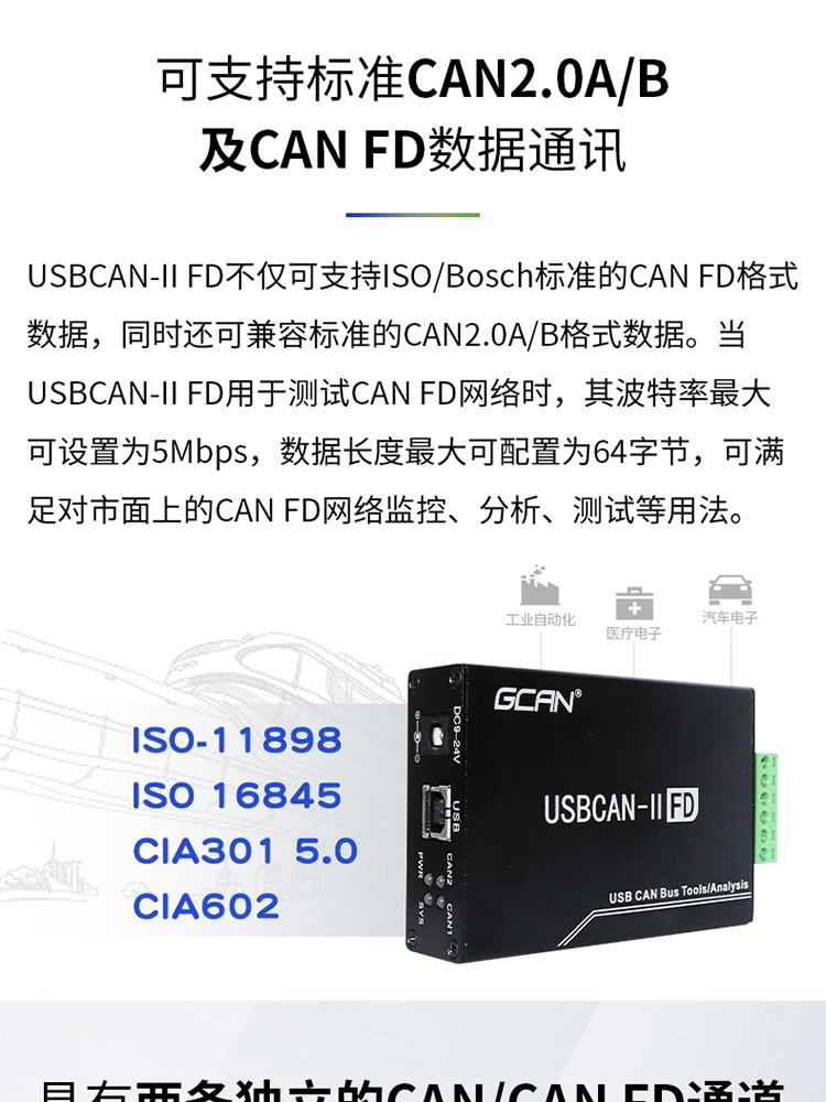 - 沈阳广成科技USBCAN-II FD是集成2路CANFD接口的高性能型总线通讯接口卡。该型号CAN卡符合USB2.0总线高速规范,具有两条独立的CAN/CAN FD通道,且信号间相互隔离。PC可以通过USB接口快速连接至CAN(FD)-bus网络,构成现场总线实验室、工业控制、智能小区、汽车电子网络等CAN(FD)-bus网络领域中数据处理、数据采集的CAN(FD)-bus网络控制节点。