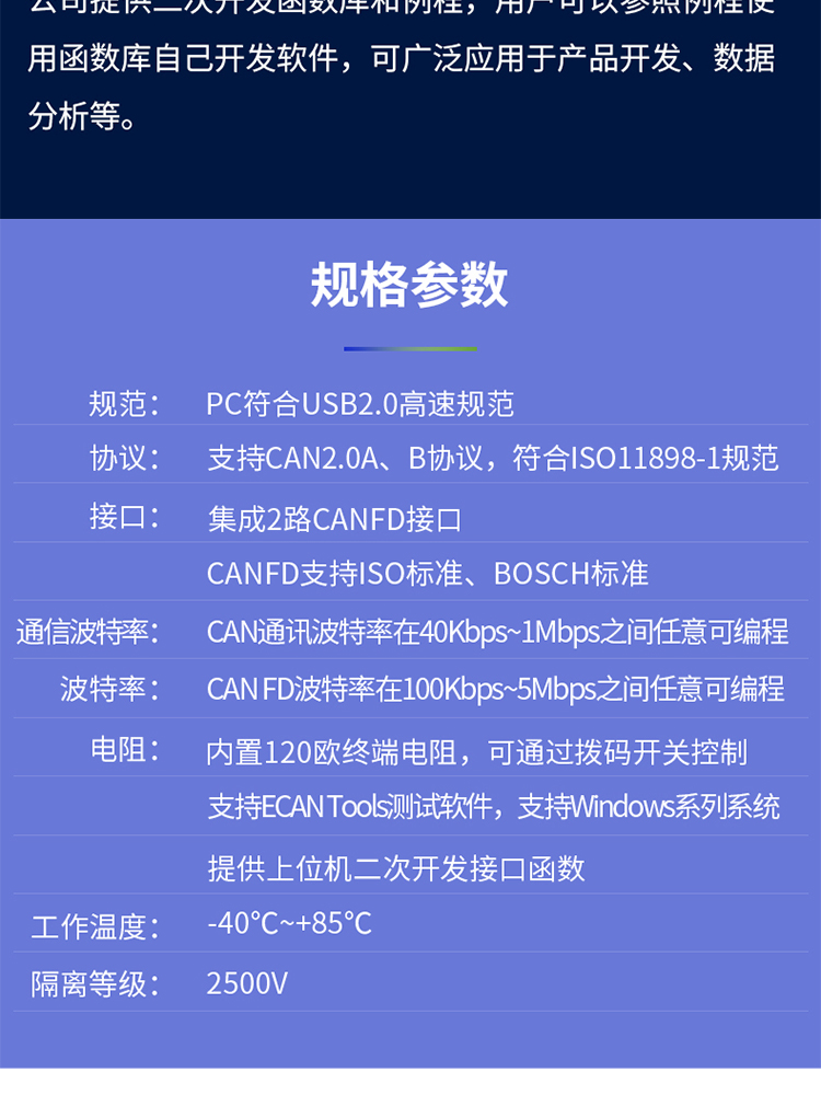 (1)PC接口符合USB2.0全速规范,兼容USB1.1及USB3.0;(2)集成2路CANFD接口,使用插拔式端子接线方式;(3)支持CAN2.0A/B协议,符合ISO 11898-1规范;(4)CAN通讯波特率在40Kbps~1Mbps之间任意可编程;(5)CANFD通讯最高波特率可支持到5M;(6)使用USB总线电源供电,或使用外接电源(DC+5V,130mA);(7)CAN(FD)-bus接口采用电气隔离,隔离模块绝缘电压:DC 2500V;(8)最高接收数据流量:14000 fps;(9)CAN端接收报文时间戳精度可达1us;(10)支持Windows XP、7、8、10等Windows操作系统;(12)支持ECANTools测试软件;(13)支持二次开发;(14)工作温度范围:-40℃~+85℃。- 产品介绍视频: