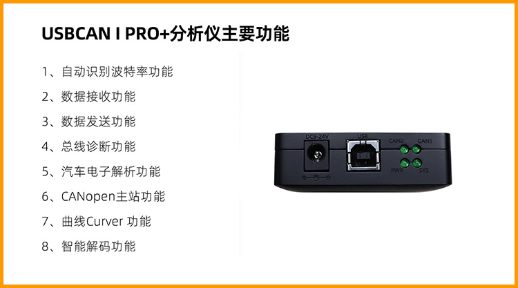 USBCAN-I Pro+高性能CAN接口卡是CAN-bus产品开发、CAN-bus数据分析的强大工具;同时具有体积小巧、即插即用等特点,也是便携式系统用户的最佳选择。USBCAN-I Pro+接口卡上自带USB接口,集成CAN接口电气隔离保护模块,使其避免由于瞬间过流/过压而对设备造成损坏,增强系统在恶劣环境中使用的可靠性。