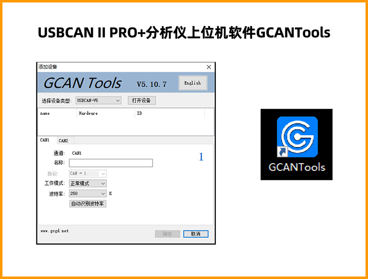 (1)PC接口符合USB2.0全速规范,兼容USB1.1及USB3.0;(2)集成1路CAN-bus接口,使用插拔式端子接线方式;(3)支持CAN2.0A和CAN2.0B帧格式,符合ISO/DIS 11898规范;(4)CAN-bus通讯波特率在5Kbps~1Mbps之间任意可编程;(5)使用USB总线电源供电(DC+5V,130mA);(6)CAN-bus接口采用电气隔离,隔离模块绝缘电压:DC 1500V;(7)最高接收数据流量:14000 fps;(8)CAN端接收报文时间戳精度可达1us;(9)支持WinXP、Win7、Win8、Win10等Windows操作系统;(10)支持Linux操作系统;(11)支持ECANTools测试软件;(12)工作温度范围:-20℃~+70℃;1、GCANTools软件与驱动安装演示