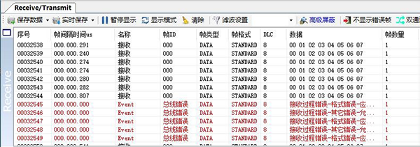 软件可以捕获总线上的错误帧,当接收到错误帧时,在接收列表中将以飘红的形式显示出来。
