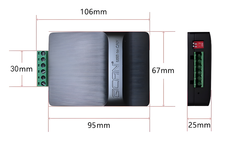 设备外形尺寸:(长,含接线端子)106mm*(宽)67mm*(高)25mm,其示意图如图2.1所示。