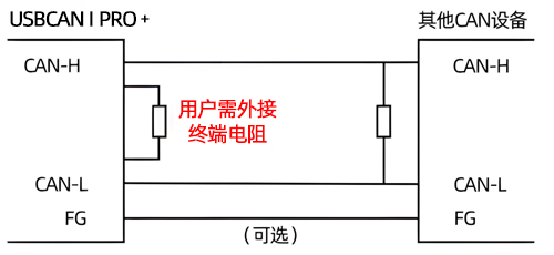 USBCAN-I Pro+接入CAN总线连接方式为将CAN_H连CAN_H,CAN_L连CAN_L即可建立通信。