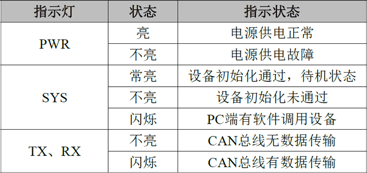 USBCAN-I Pro+接口卡具有1个PWR指示灯、1个SYS指示灯、1个RX指示灯、1个TX指示灯来指示设备的运行状态。这4个指示灯的具体指示功能见表3.2,这4个指示灯处于各种状态下时,CAN总线的状态如表3.3所示。