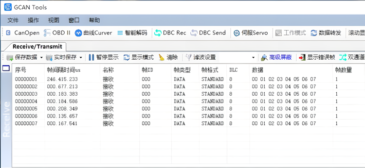 设备参数设置好后,软件就进入工作状态,如果总线上有数据,这时接收数据窗口就会有数据显示。接收窗口如下图所示: