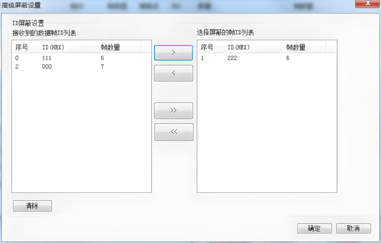 GCANTools软件可以屏蔽接收到的指定的CAN帧数据。GCANTools软件可以将接收到的数据按帧ID归类后合并显示在左侧的待屏蔽列表中,从左边的列表中您可以选择需要屏蔽的帧ID,点击向右箭头即可将选中的帧ID添加到屏蔽列表中,软件将自动屏蔽右侧列表中所有以此帧ID开头的所有数据,屏蔽列表可以设置多条屏蔽帧ID。