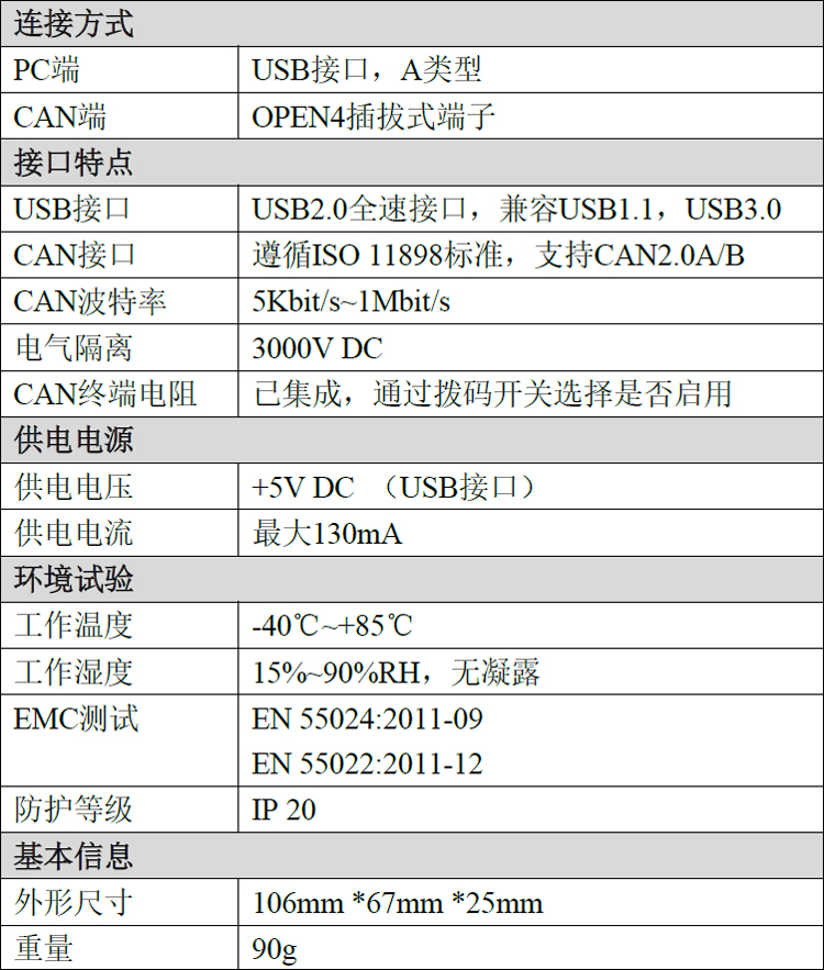● PC接口符合USB2.0全速规范,兼容USB1.1及USB3.0;● 集成1路CAN-bus接口,使用插拔式端子接线方式;● 支持CAN2.0A和CAN2.0B帧格式,符合ISO/DIS 11898规范;● CAN-bus通讯波特率在5Kbps~1Mbps之间任意可编程;● 使用USB总线电源供电(+5V DC,130mA);● CAN-bus接口采用电气隔离,隔离模块绝缘电压:3000V DC;● 静电放电抗扰度等级:接触放电±4KV,空气放电±8KV;● 电快速瞬变脉冲群抗扰度等级:CAN总线接口±2KV;● 浪涌抗扰度等级:CAN总线接口±4KV;● 最高接收数据流量:14000 fps;● CAN端接收报文时间戳精度可达1us;● 支持WinXP、Win7、Win8、Win10等Windows操作系统;● 支持Linux操作系统;● 支持GCANTools测试软件;● 工作温度范围:-40℃~+85℃;
