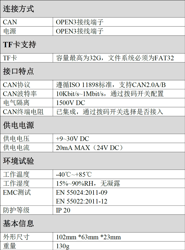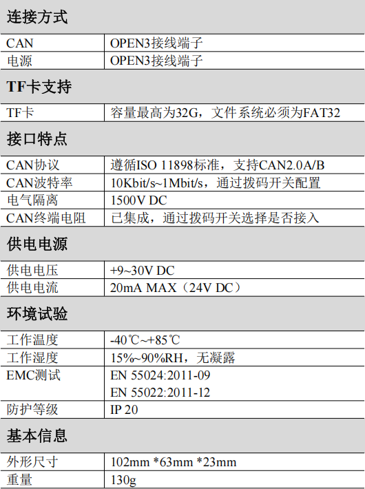 ● 高速的32位工业级处理器;● 使用外接电源供电(9~30V DC);● 供电电流:20mA,24V DC;● 集成1路标准CAN总线接口,使用OPEN3接线端子;● CAN总线支持CAN2.0A、CAN2.0B帧格式,符合ISO/DIS 11898标准;● CAN总线通讯波特率在10Kbps~1Mbps之间可通过拨码开关配置;● CAN总线接口采用电气隔离,隔离模块绝缘电压:2500V DC;● 最高接收数据流量:2000 fps/秒;● CAN数据带有时间戳,精度0.1ms;● 工作温度范围:-40℃~+85℃;● 静电放电抗扰度等级:接触放电±4KV,空气放电±8KV;● 电快速瞬变脉冲群抗扰度等级:±2KV;● 浪涌抗扰度等级:电源接口±1KV。CAN总线接口±4KV;● 工作湿度范围:5%~95%RH无凝露;