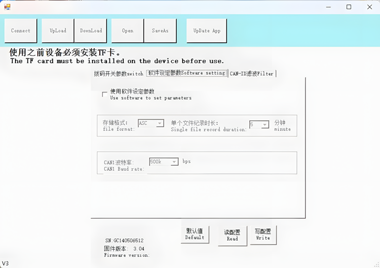请注意:.DAT格式文件建议保存成每分钟一个文件,避免造成数据损坏丢失;勾选“使用软件设定参数”之后以软件配置为准,设备硬件拨码拨到数字一侧。