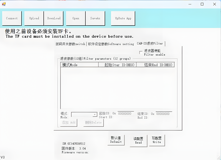 请注意:点击“默认值”会使所有配置内容恢复为默认状态。默认工作模式为软件配置无效,无滤波。