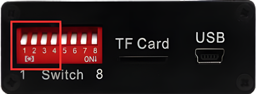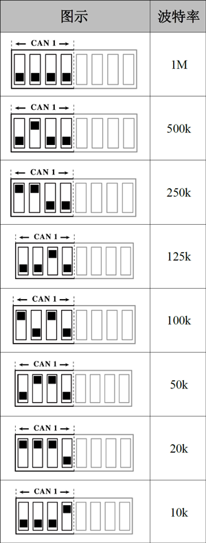 系统先不要上电,拨码开关的“1、2、3、4”号可以对CAN总线波特率进行配置,端子(5、8)有特殊定义,默认朝下,请勿随意设置。拨码开关向下默认为0,具体各波特率详见表3.1。