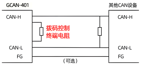GCAN-401系列模块CAN通道内部已经集成标准120Ω终端电阻,可通过拨码开关选择是否将电阻接入总线:两个开关控制同一个电阻,一起对R1、R2进行操作,拨到ON的位置即可将电阻启用。