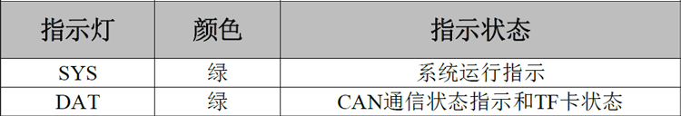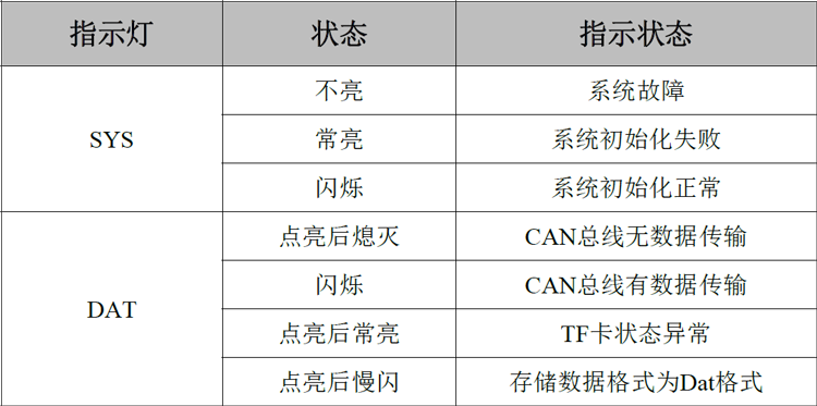 CAN总线数据存储器具有1个SYS指示灯用来指示系统运行状态,1个DAT指示灯用来指示CAN总线数据传输和TF卡状态。这2个指示灯的具体指示功能见表3.3,这2个指示灯处于各种状态的含义如表3.4所示。