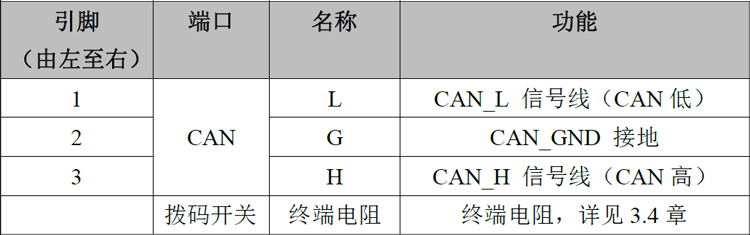 注意:CAN电缆可以使用普通双绞线、屏蔽双绞线。理论最大通信距离主要取决于总线波特率,最大总线长度和波特率关系详见表3.2。若通讯距离超过1Km,应保证线的截面积大于Φ1.0mm2,具体规格应根据距离而定,常规是随距离的加长而适当加大。