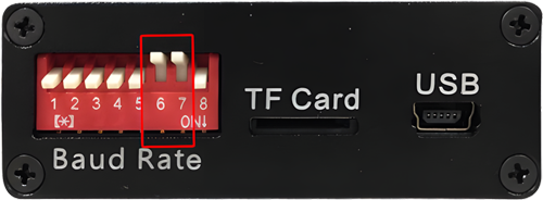 CAN总线数据存储器模块可以支持10K~500K之间一组常用的波特率,可以通过操作设备侧面的拨码开关,对波特率进行配置,拨码开关位置如图3.6所示。