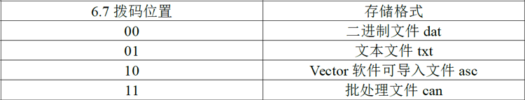 CAN总线数据存储器支持四种保存数据格式:二进制文件(.DAT)、文本文件(.TXT)、Vector软件可导入文件(.ASC)、批处理文件(.CAN)可通过8位拨码开关中的第六和七个开关切换,如图4.2所示。