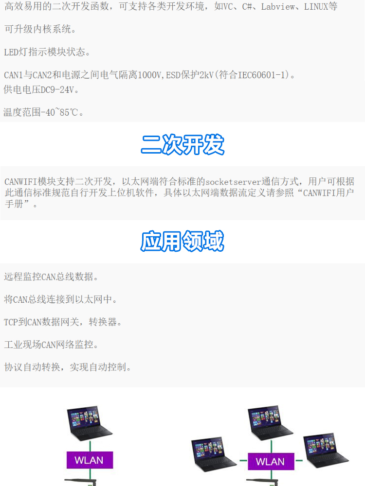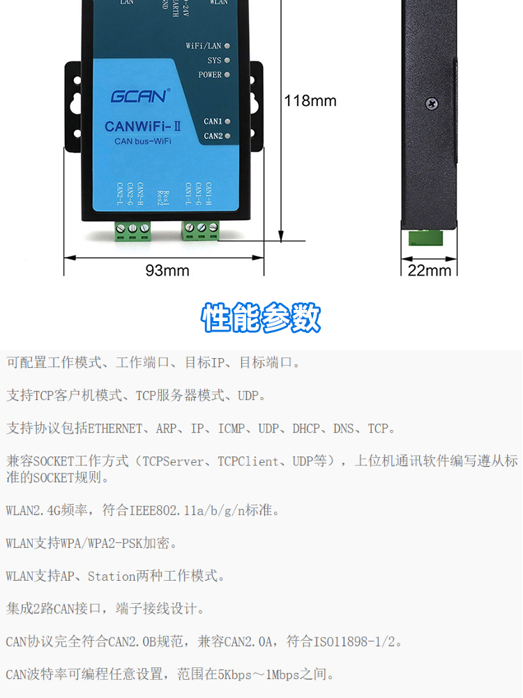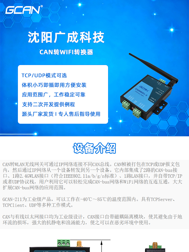 - 广成科技GCAN-211型CAN转WiFi模块的设备参数包括: