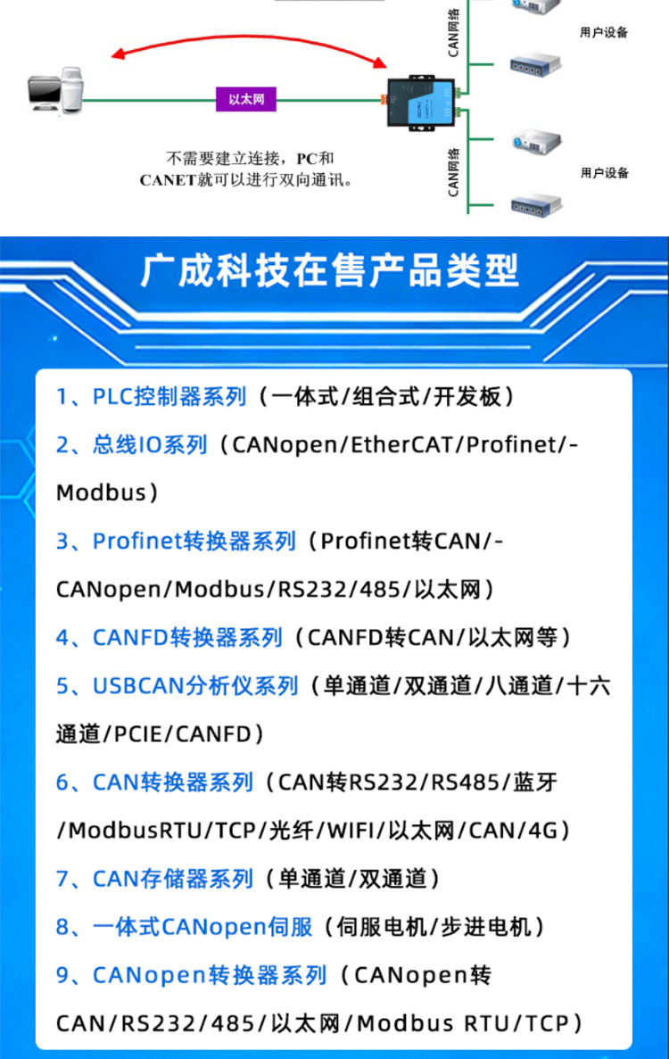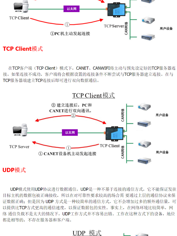 (1)高速的32位工业级处理器;(2)内嵌硬件看门狗定时器;(3)模块内置FLASH储存器,可储存参数;(4)使用外接电源供电(DC+9~24V),推荐电源值12V或24V;(5)供电电流:80mA,24V DC;(6)静电放电抗扰度等级:接触放电±2KV,空气放电±15KV;(7)电快速瞬变脉冲群抗扰度等级:±1KV;(8)浪涌抗扰度等级:±1KV;(9)工作温度范围:-40℃~+85℃;(10)工作湿度范围:5%~95%RH无凝露;(11)螺丝固定的安装方式,专为工业设计。(12)集成2路CAN-bus接口,采用凤凰端子接线方式;(13)CAN-bus信号包括:CAN_H、CAN_L、CAN_GND;(14)CAN-bus支持CAN2.0A和CAN2.0B帧格式,符合ISO/DIS11898规范;(15)CAN-bus通讯波特率在5Kbps~1Mbps之间任意可编程;(16)CAN-bus接口采用电气隔离,隔离模块绝缘电压:DC 2500V;(17)32个硬件FIFO接收缓冲器,最高接收数据流量:8000帧/秒;(18)CAN端接收报文时间戳精度可达1us。(19)PC接口使用标准以太网接口,RJ45,支持10/100M自适应;(20)支持超时断开功能;(21)工作端口、目标IP和目标端口均可设定;(22)网络断开后自动恢复连接资源,可靠地建立TCP连接;(23)TCP支持多达255个连接,满足6组用户同时管理一个CAN口;(24)UDP方式下每个CAN口支持6组目标IP段,多个用户可同时管理一个CAN设备;(25)支持协议包括ETHERNET、ARP、IP、ICMP、UDP、DHCP、DNS、TCP;(26)兼容SOCKET工作方式(TCP Server、TCP Client、UDP等),上位机通讯软件编写遵从标准的SOCKET规则。(27)集成2.4G WLAN接口,符合IEEE802.11a/b/g标准;(28)支持AP与Station模式; - 1、GCAN-204 modbus RTU转CAN设备使用