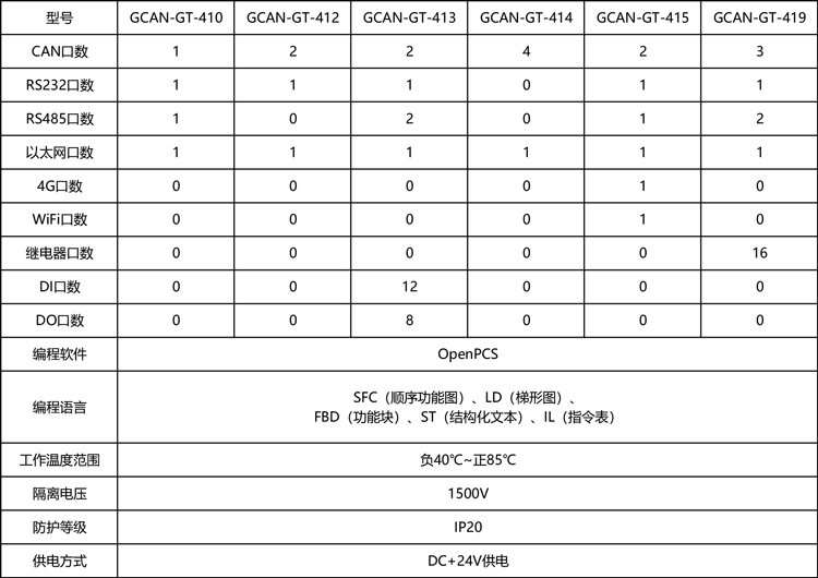 GCAN-GT-415可使用OpenPCS软件对其编程,该软件支持符合IEC-61131-3标准中规定的五种标准PLC编程语言,如:SFC(顺序功能图)、LD(梯形图)、FBD(功能块)、ST(结构化文本)、IL(指令表),这使得程序的可移植性和复用性很强,而且该软件还具有多种调试功能(如断电、单步、监控等),使调试程序更加方便。