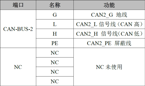 GCAN-GT-415模块CAN1-bus接口由1个4 Pin接线端子引出,有2个独立的CAN接口,其接口定义如表所示。