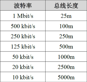 请注意:CAN-bus电缆可以使用普通双绞线、屏蔽双绞线。理论最大通信距离主要取决于总线波特率,最大总线长度和波特率关系详见下表。若通讯距离超过1km,应保证线的截面积大于Φ1.0mm2,具体规格应根据距离而定,常规是随距离的加长而适当加大。