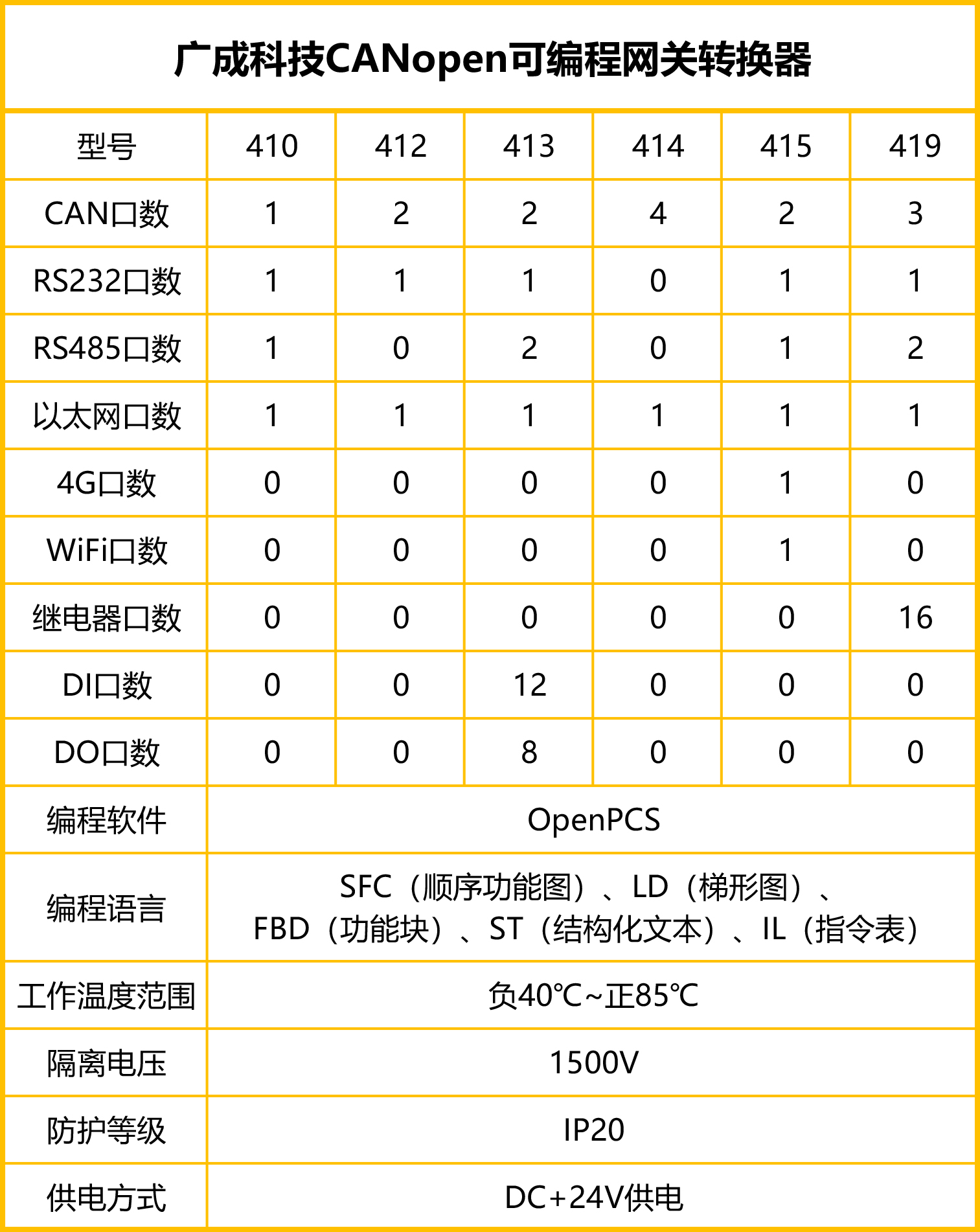 沈阳广成科技GCAN-GT-419是一种可编程的总线网关/转换器。该设备集成了3路CAN总线接口、1路以太网总线接口、2路RS485总线接口、1路RS232总线接口,在实际使用前,用户需要通过OpenPCS软件对该设备编写应用程序,以此来实现不同总线接口之间数据的互相转换。GCAN-GT-419模块支持多种标准通信协议,如CANopen、SAE J1939、Modbus TCP、Modbus RTU等,用户在实际使用时可直接选择对应协议的功能块加载即可使用,功能块的加入使得用户编程工作变得简单,用户只需了解基本的PLC编程指令和对应总线对应协议的特点和参数即可完成编程工作。GCAN-GT-419模块支持16路数字量DI输入和16路继电器输出。